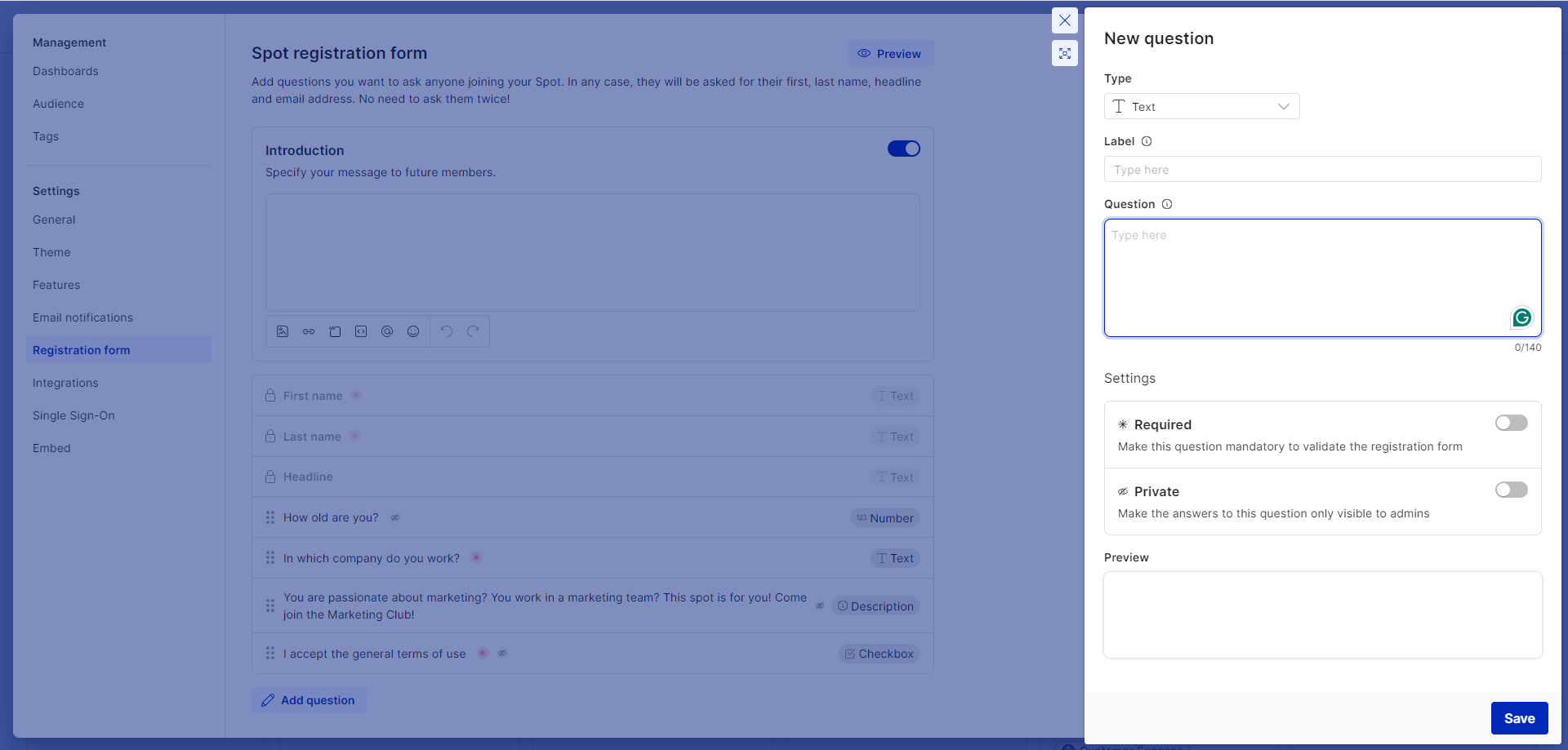 From your Spot's settings, you can edit the registration form by adding to the default questions any question you think is relevant to your community members.