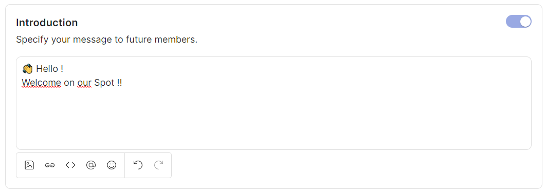 You can add an introduction at the beginning of the registration form to welcome your members. To do this, simply activate the introduction and fill in the text box with what you'd like to say to your members. Use the option bar below the text box to add text, images, links, videos and more.