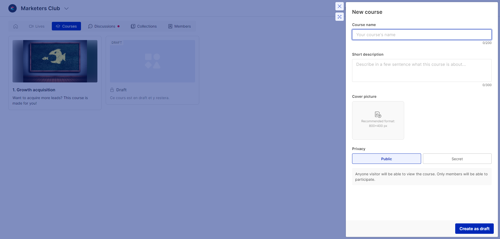 Don't worry, once created, **the course is in 'draft' mode and is not yet visible** to any member or visitor.