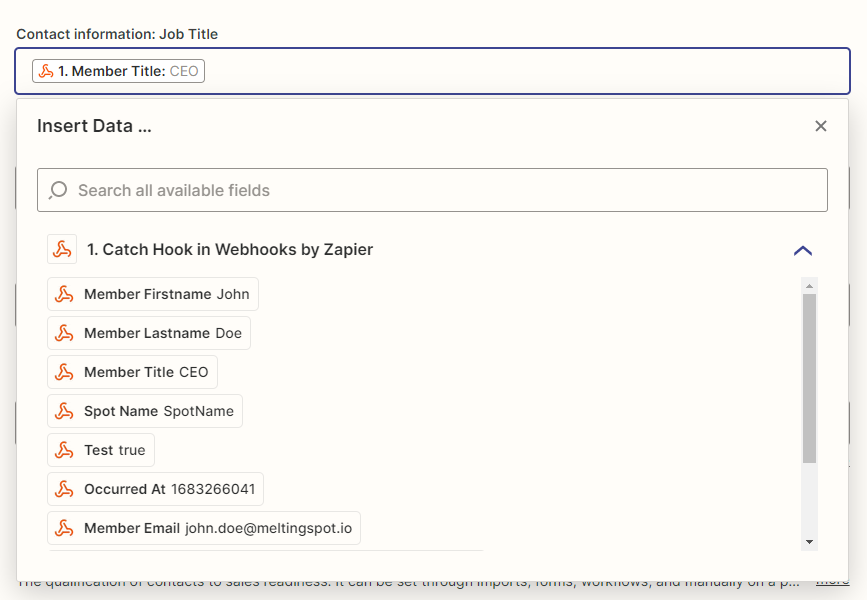 3. Remplissez les fonctions dont vous avez besoin avec les données envoyées avec MeltingSpot et continuer.