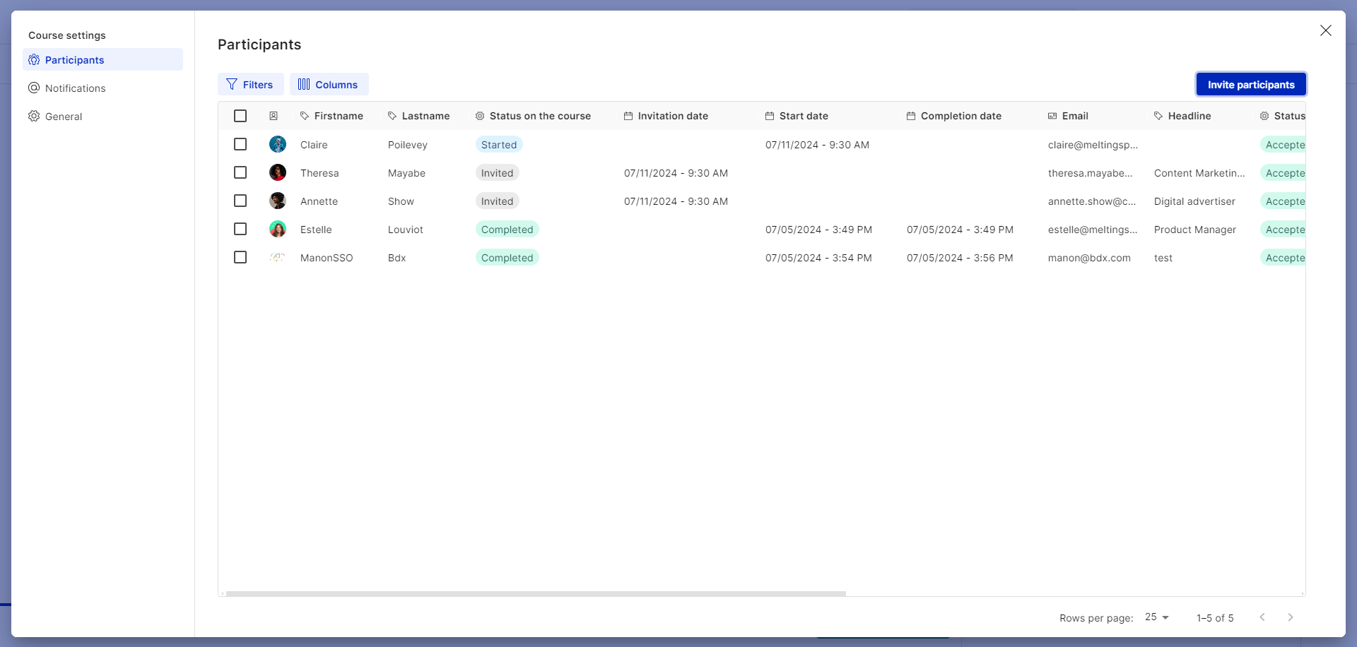 Depuis cette page, vous pouvez voir la totalité des participants à votre cours. Tous les participants sont rangés dans un tableau, ce qui vous permet de facilement filtrer et ordonner votre tableau pour les gérer au mieux.&#x20;