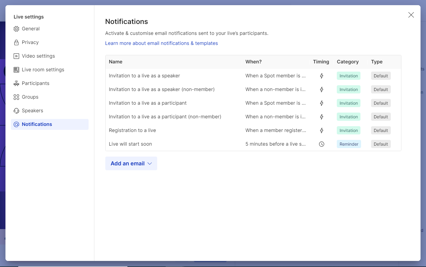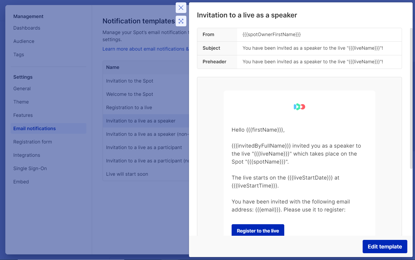 Un email de notification pour un live est éditable à 2 niveaux : dans les paramètres du Spot et dans les paramètres de chacun des lives.