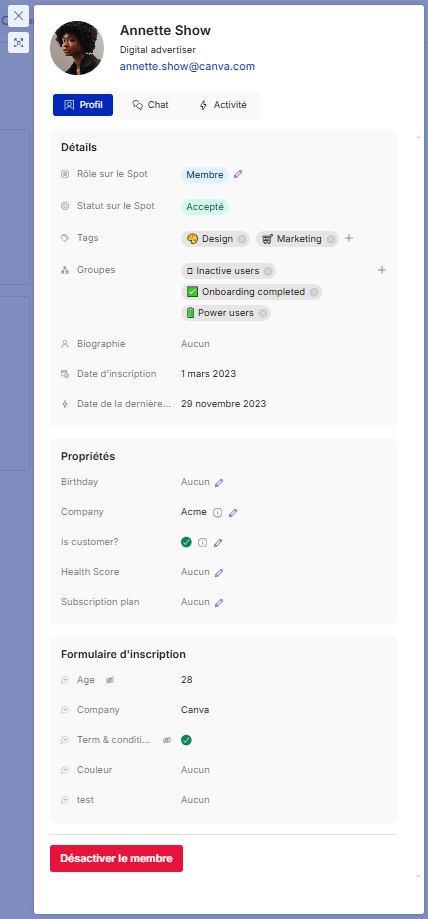 * **Valeurs des propriétés** : les valeurs des différentes propriétés personnalisées pour ce membre. - <mark style="color:red;">Uniquement visible par les admins.</mark>
